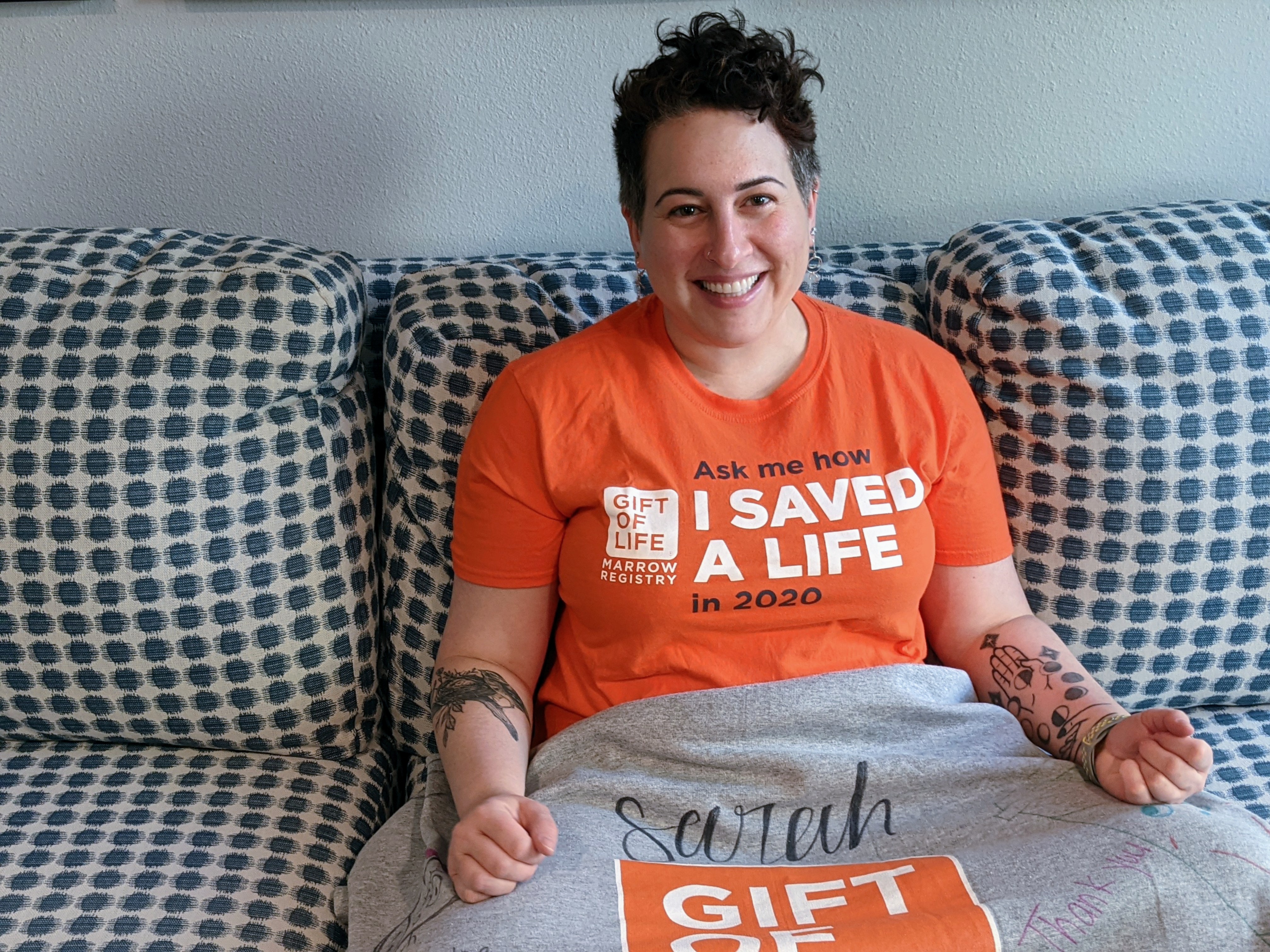 Sarah joined the Gift of Life Marrow Registry and was identified as a match for patient in 2021. She was surprised to learn she was a match and excited to learn more. "He's a 66 year-old man with Hodgkin's lymphoma, he's my dad's age. I hope that if the transplant was successful, he gets many more years to enjoy the people and places he loves. When I'm feeling down, I imagine a hair-thin, silver thread connecting met o him, wherever he is. There is always this invisible web binding us together as members of the same human family. And the world i full of people who have been moved to help others and are forever connected in this way."