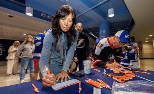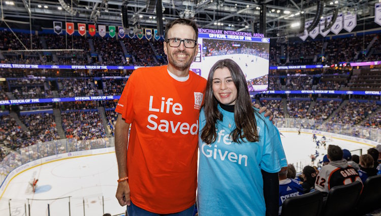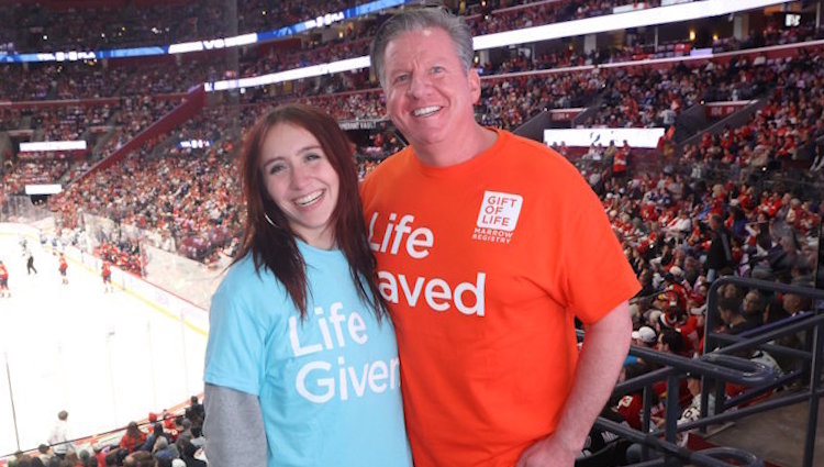 Tampa Bay Lightning fans offered truly thunderous applause and cheers at the Benchmark International Arena on November 24, when Gift of Life stem cell donor Leah Falk, 21, of Rockland, Md., was introduced to leukemia survivor Andy King, 48, of Westminster, Colo., for the first time. The excitement of seeing their meeting caused a long line of hopeful new registry members to visit the swabbing table in the concourse.